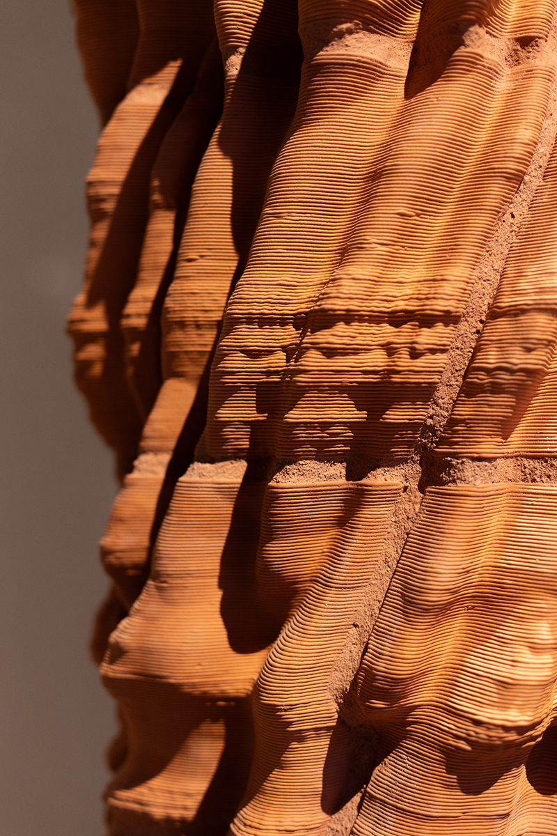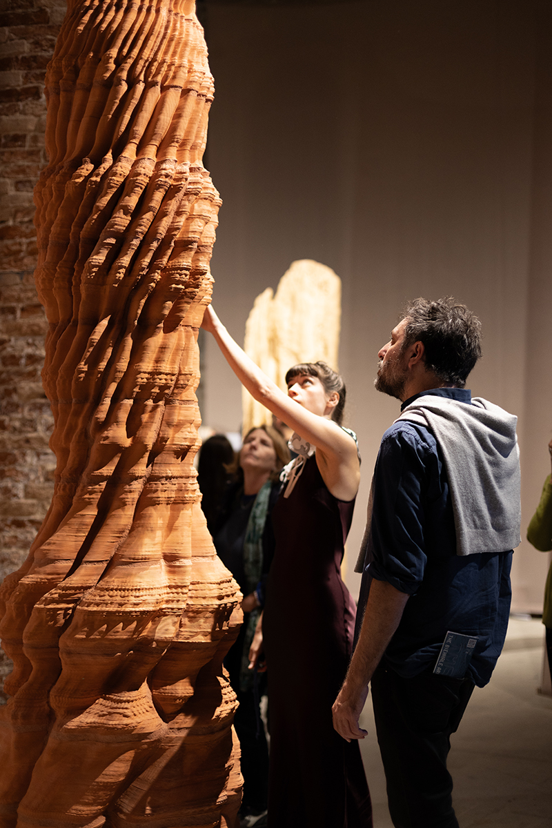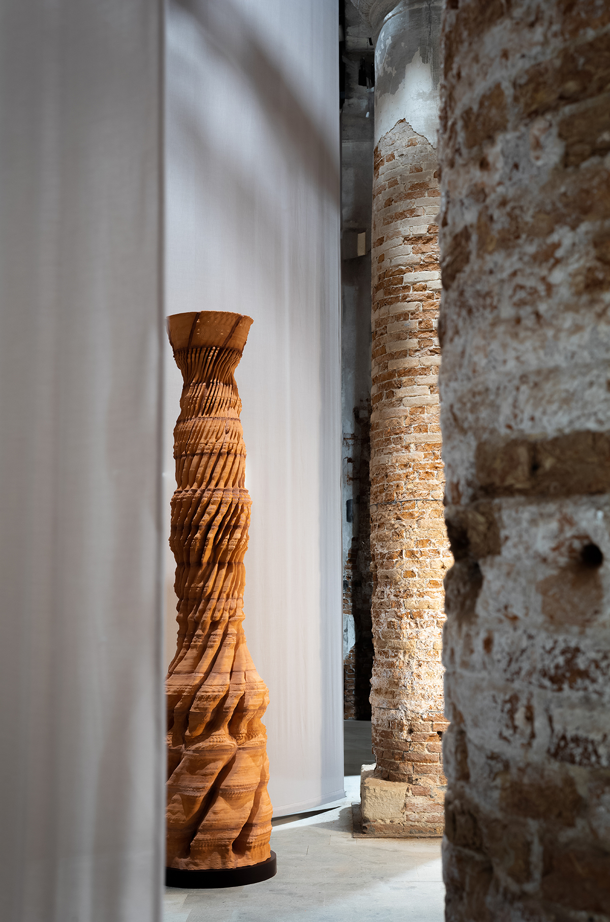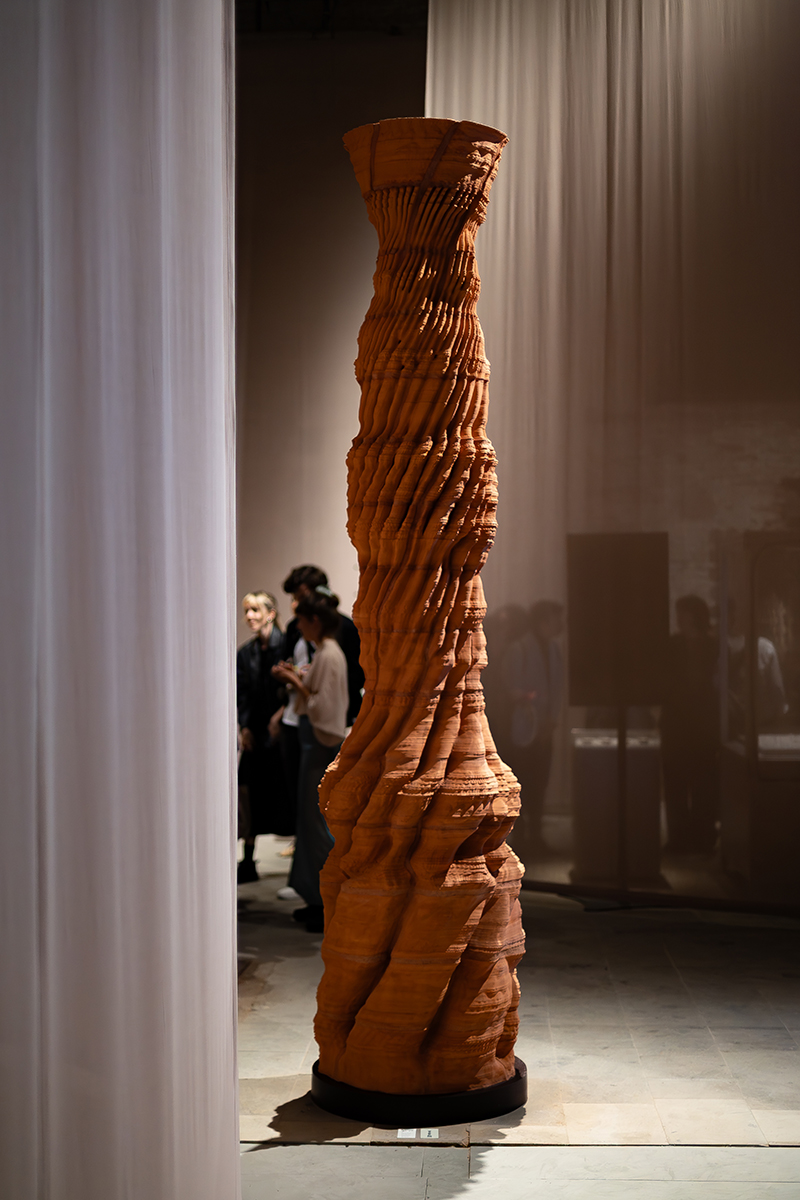 The work is inspired by Christopher Alexander’s theories on Relatedness and stems from an ongoing investigation into the relationship between material, form, and human experience. In dialogue with the six-meter-tall columns of the historic Corderie halls, Liminis consists of 90 unique terracotta bricks, each 3D-printed and assembled on site using reinforcement and mortar. Six grooves branch fractally along the surface, multiplying as they rise. While the column carries classical references, it stands apart through a distinctly organic expression that reimagines traditional architectural language.