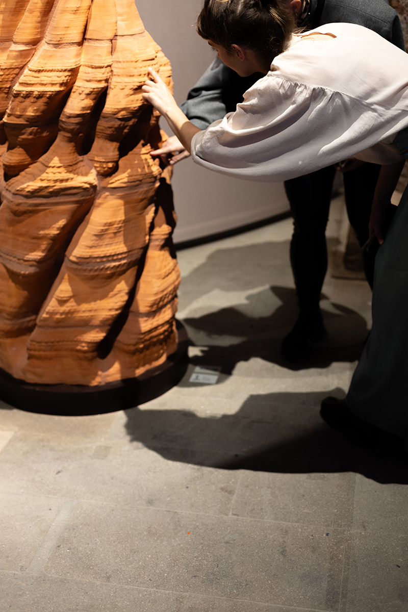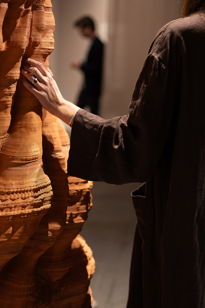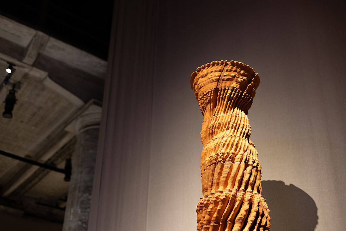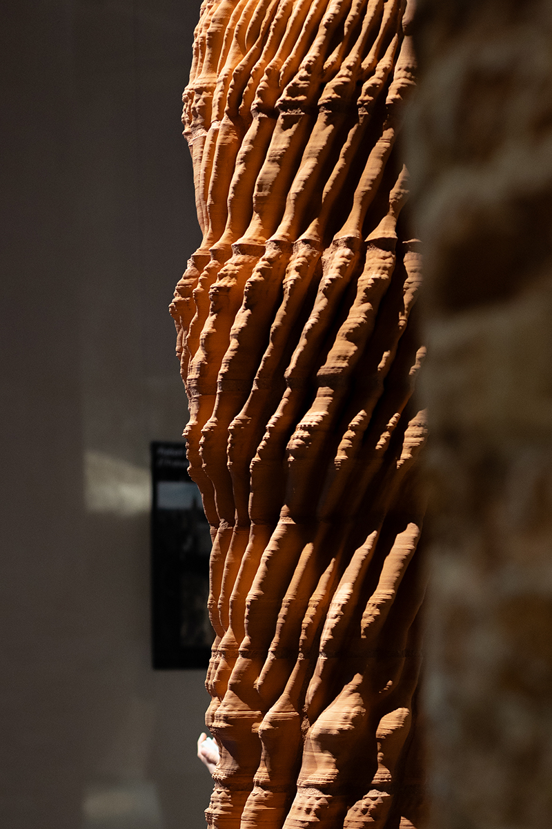 The work is inspired by Christopher Alexander’s theories on Relatedness and stems from an ongoing investigation into the relationship between material, form, and human experience. In dialogue with the six-meter-tall columns of the historic Corderie halls, Liminis consists of 90 unique terracotta bricks, each 3D-printed and assembled on site using reinforcement and mortar. Six grooves branch fractally along the surface, multiplying as they rise. While the column carries classical references, it stands apart through a distinctly organic expression that reimagines traditional architectural language.