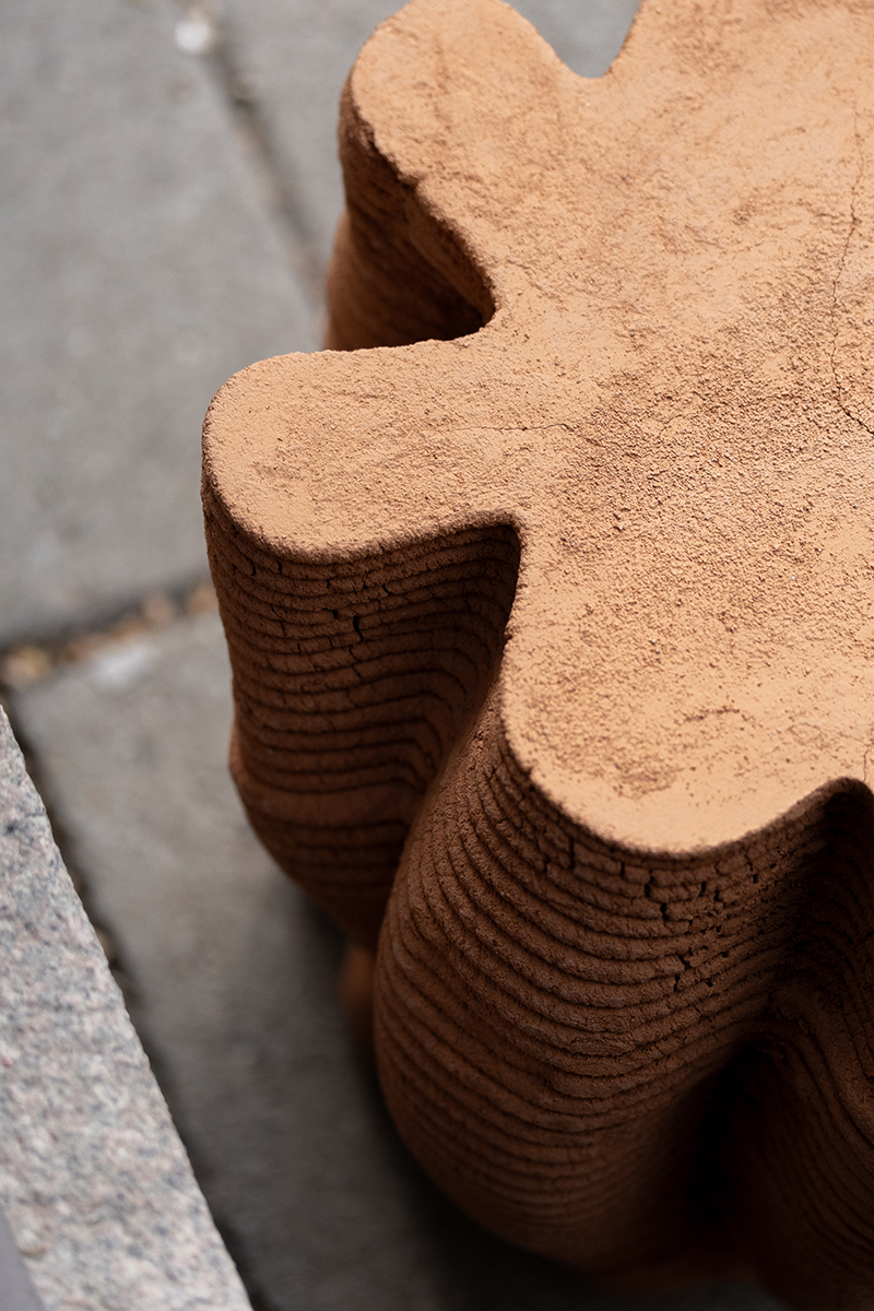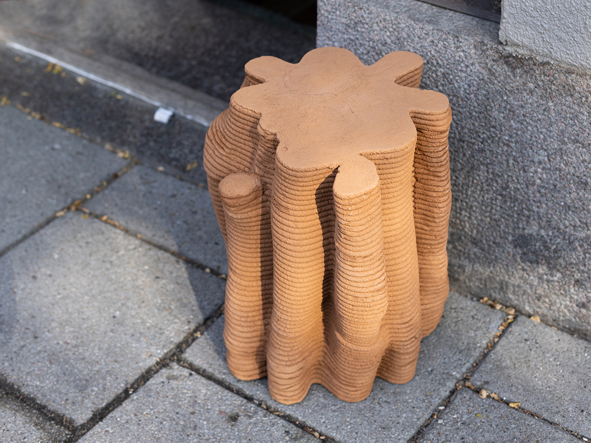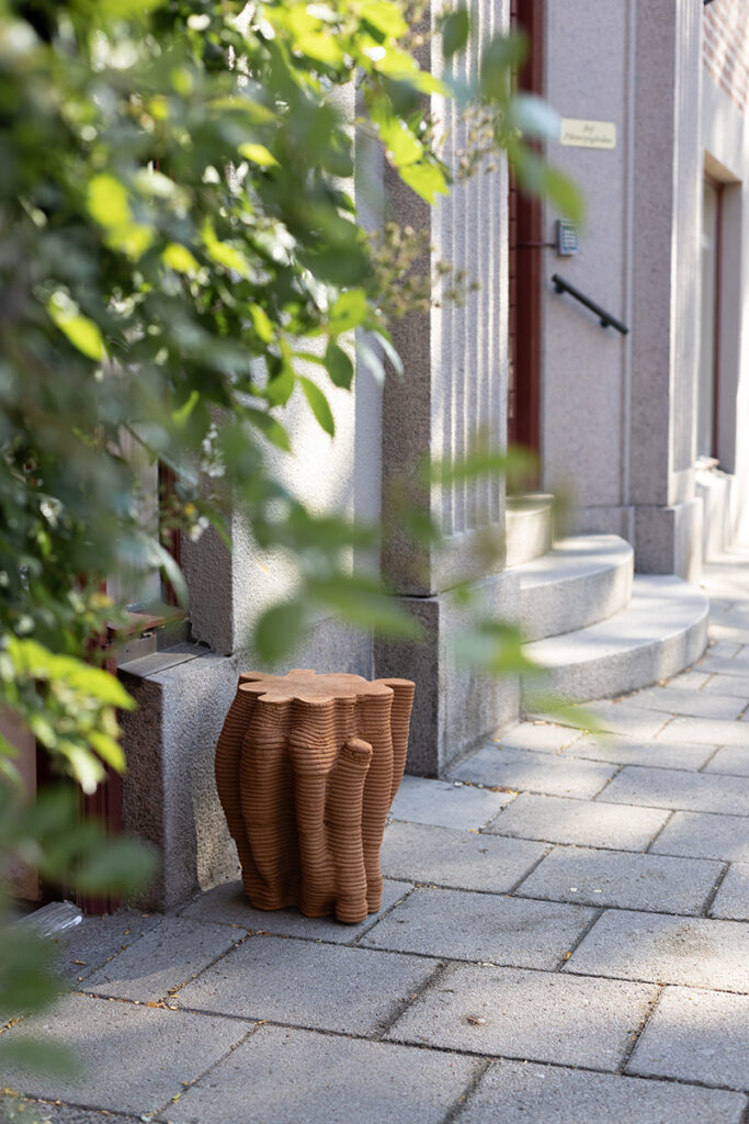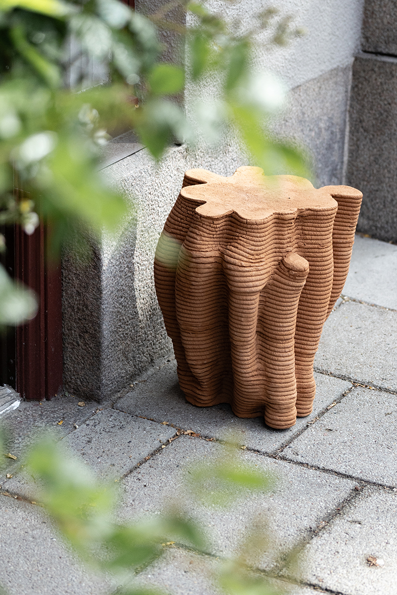 Moba is an outdoor stool created through large-scale robotic 3D printing in collaboration with architect Anton Tetov Johansson. Crafted from clay, the piece is printed in layers and then kiln-fired, combining digital fabrication techniques with traditional ceramic processes. The form is produced through procedural design.