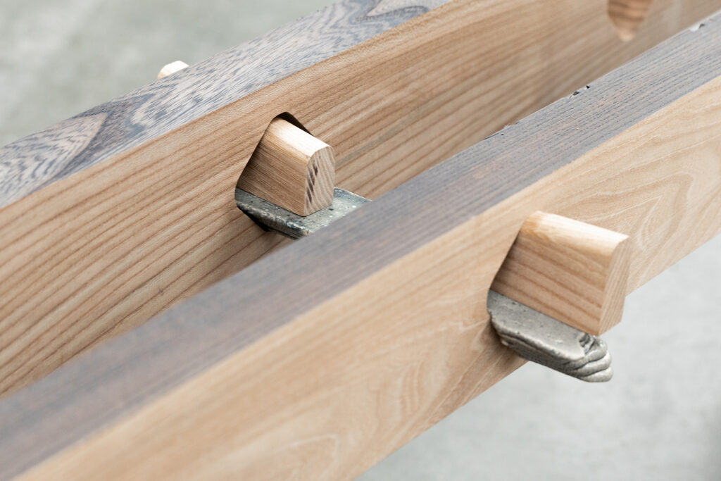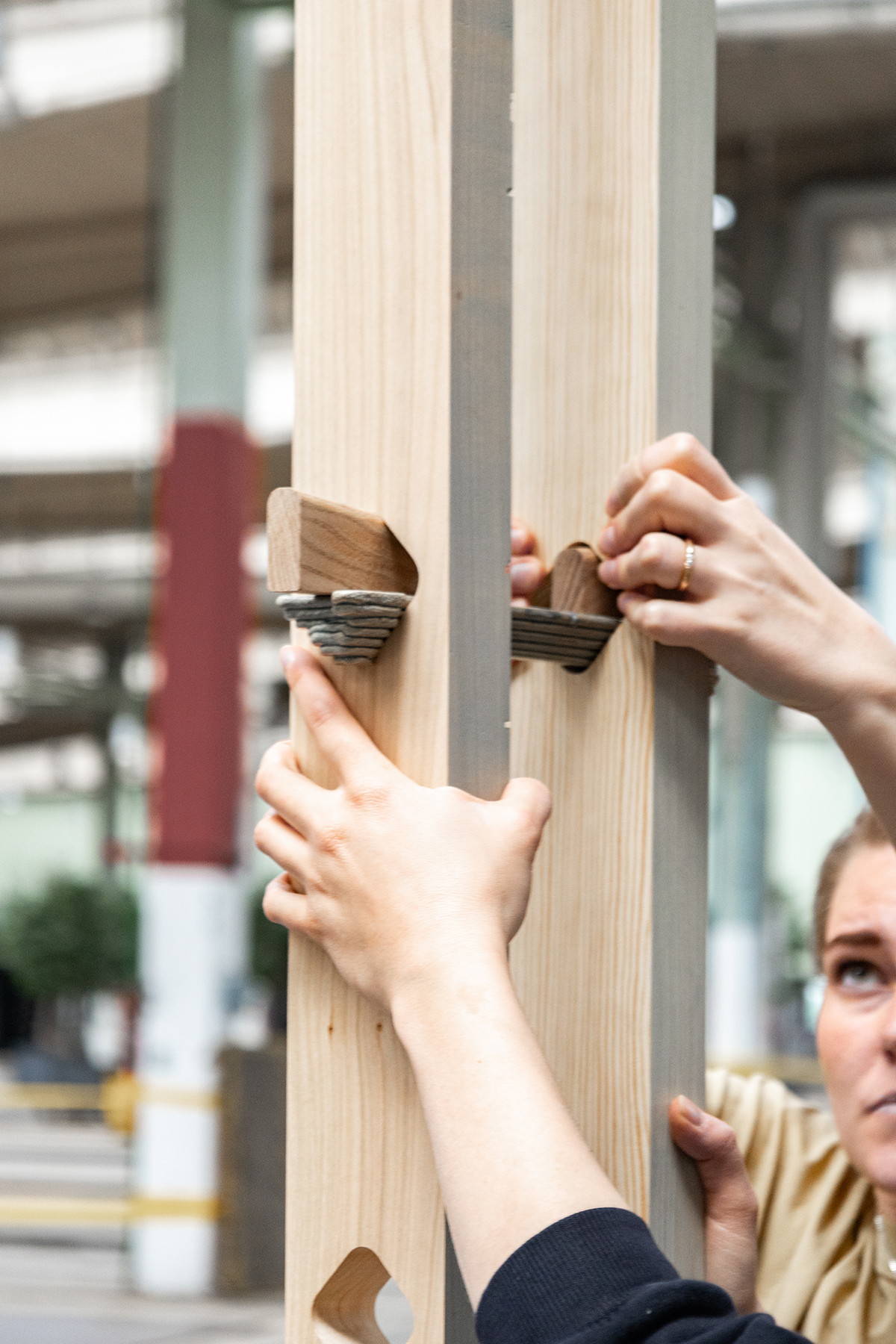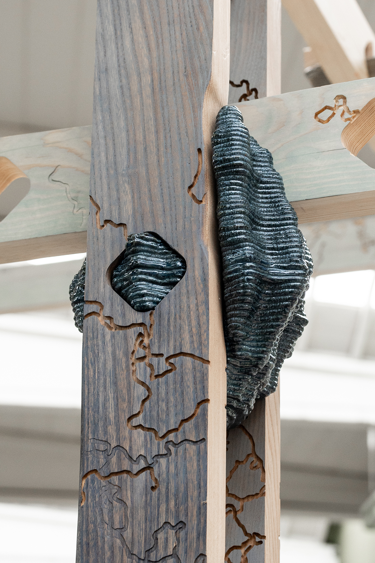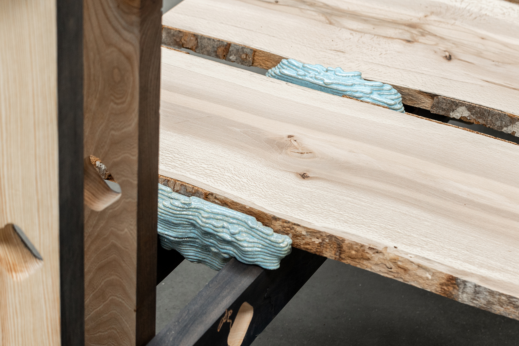 In this system, ceramic joints act as the load-bearing and connecting components, while the wood spans between them, all assembled without adhesives. There are four types of ceramic joints: the plinth, the hanger, the holder, and the dogbone, each unique and fabricated through ceramic 3D printing. The wood elements are CNC-milled with regularly spaced holes designed to accommodate the various joints.