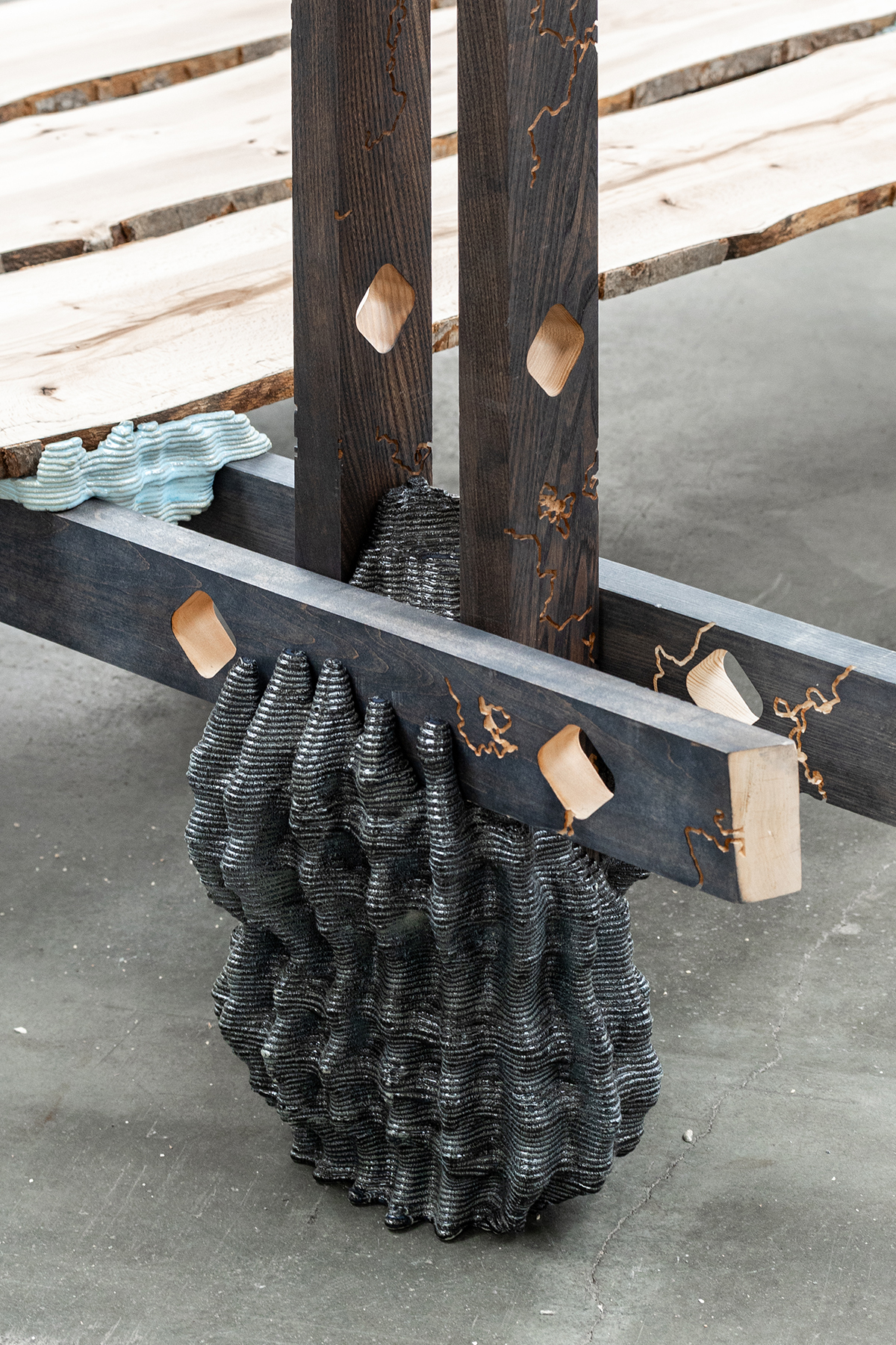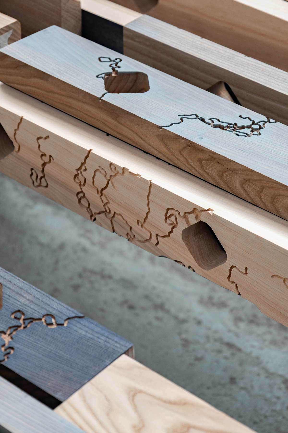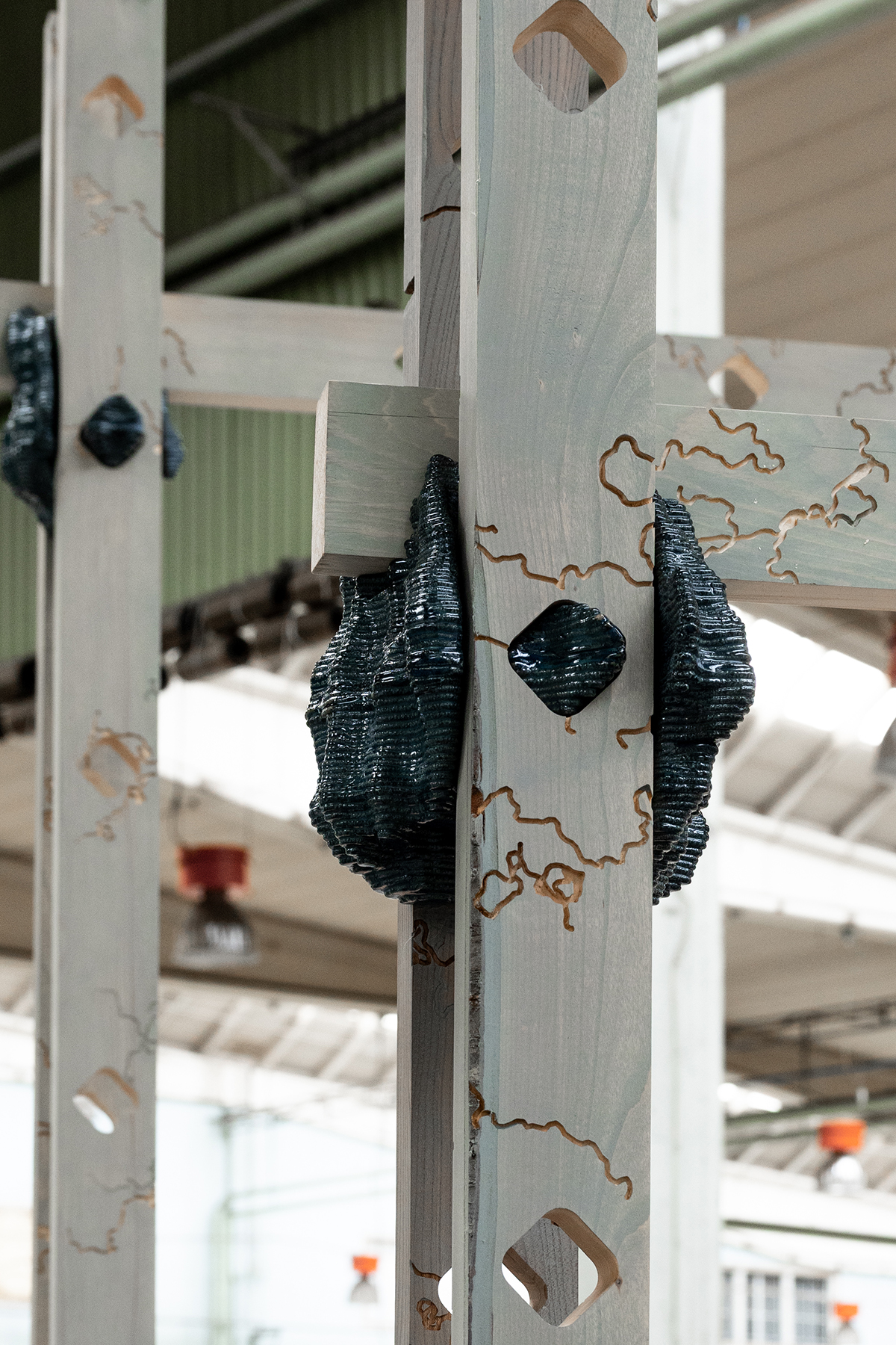 In this system, ceramic joints act as the load-bearing and connecting components, while the wood spans between them, all assembled without adhesives. There are four types of ceramic joints: the plinth, the hanger, the holder, and the dogbone, each unique and fabricated through ceramic 3D printing. The wood elements are CNC-milled with regularly spaced holes designed to accommodate the various joints.