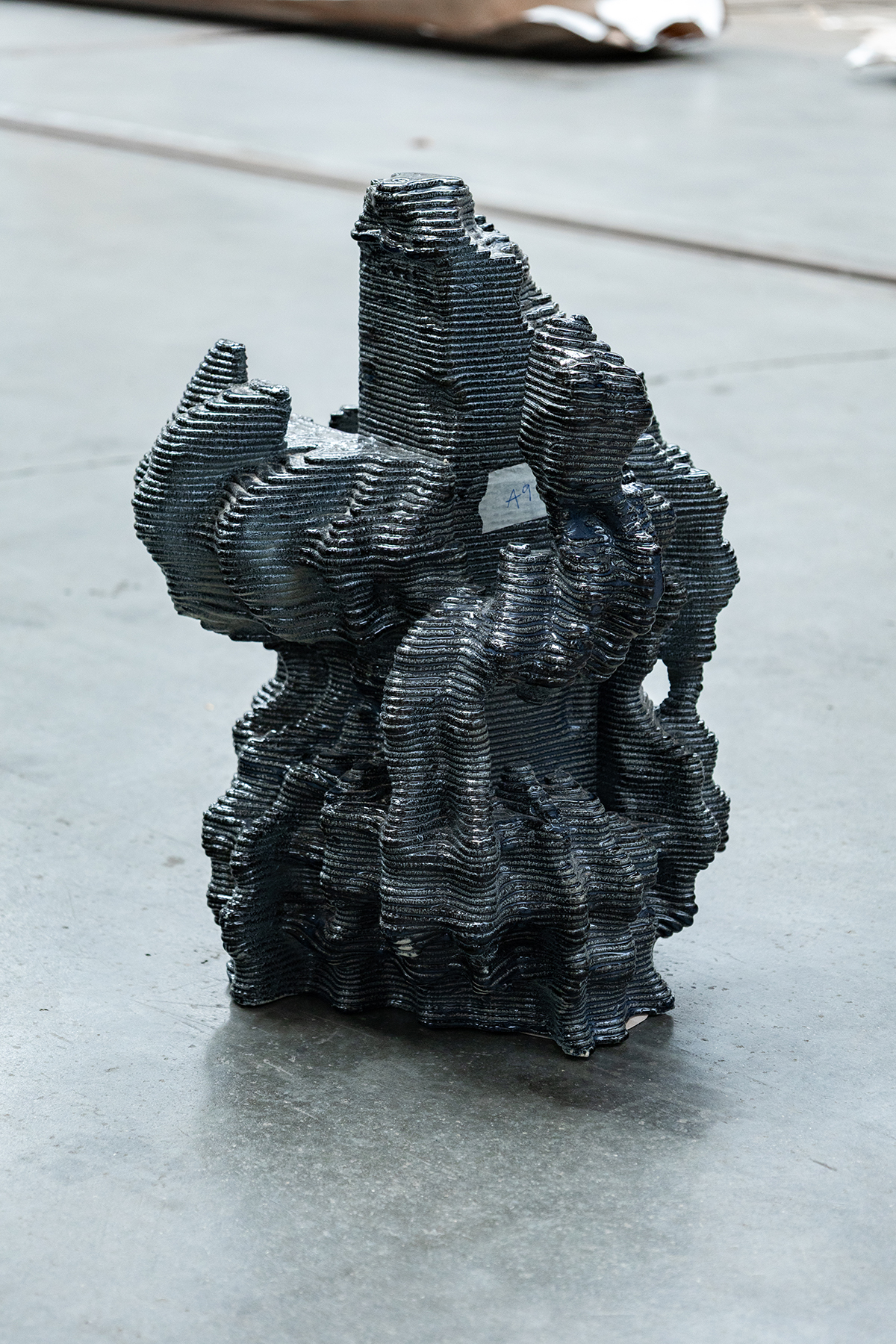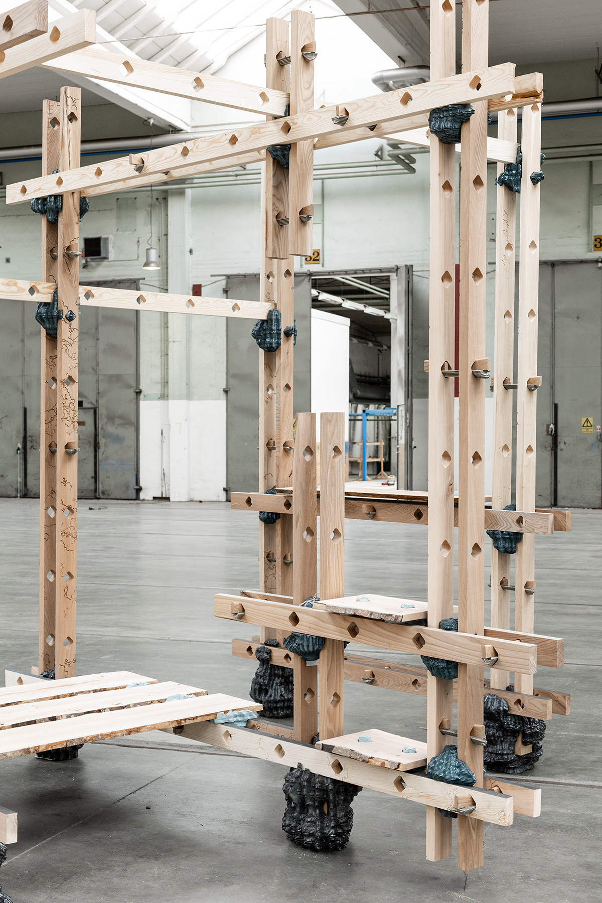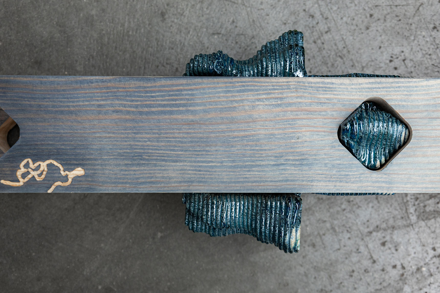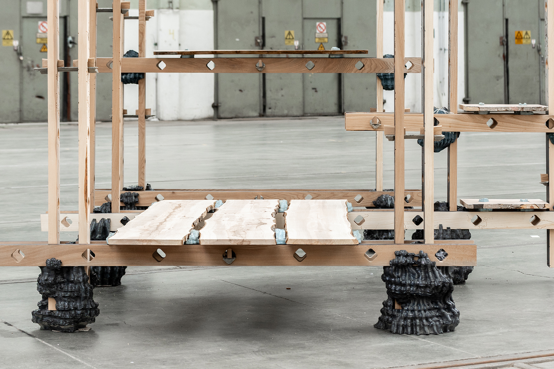 In this system, ceramic joints act as the load-bearing and connecting components, while the wood spans between them, all assembled without adhesives. There are four types of ceramic joints: the plinth, the hanger, the holder, and the dogbone, each unique and fabricated through ceramic 3D printing. The wood elements are CNC-milled with regularly spaced holes designed to accommodate the various joints.