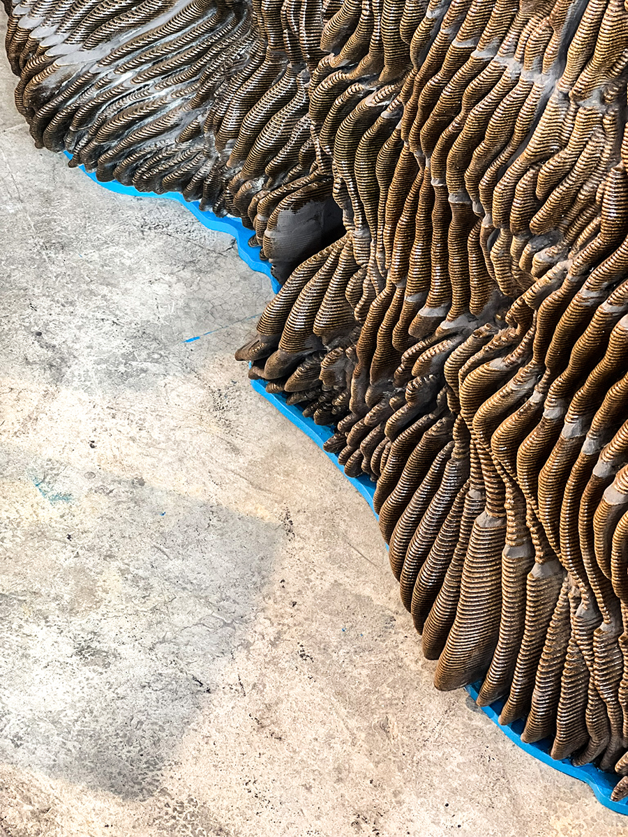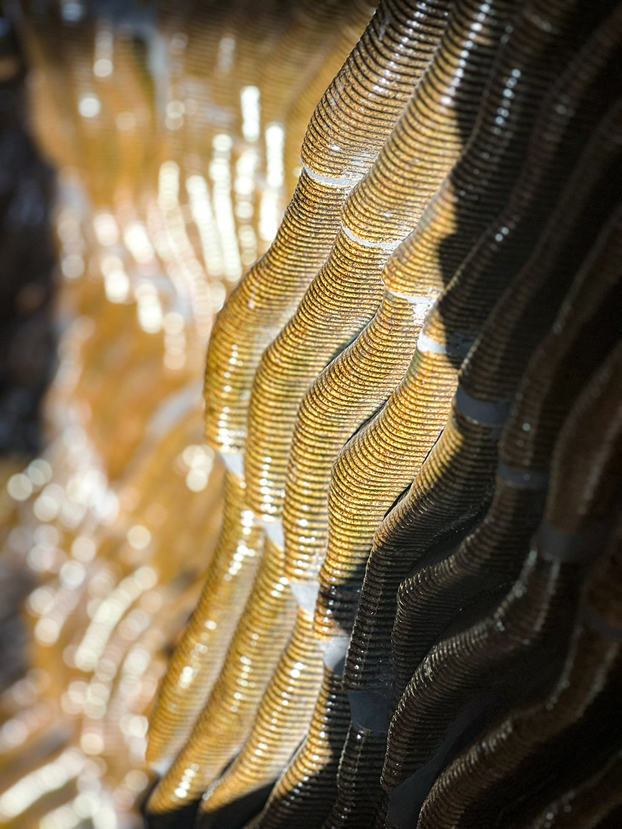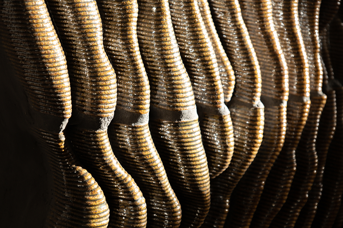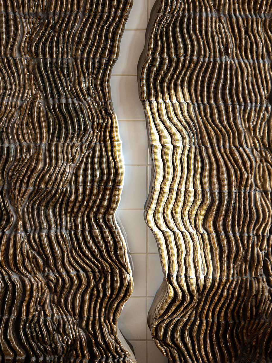 Each element is uniquely shaped and materialized through ceramic 3D printing, then glazed and assembled using fix and tile grout. The design draws inspiration from the natural process of water gradually carving through limestone, resulting in soft, undulating forms that challenges the rigidity typically associated with ceramic surfaces. Rather than conforming to linear patterns or uniform repetition, the wall offers a dynamic, flowing presence that invites tactile interaction as much as visual contemplation.