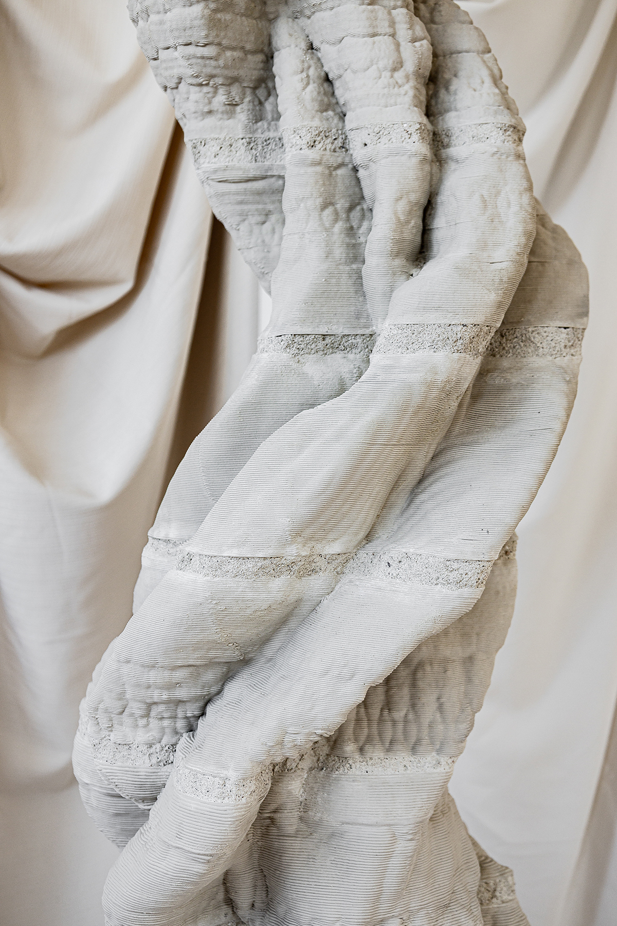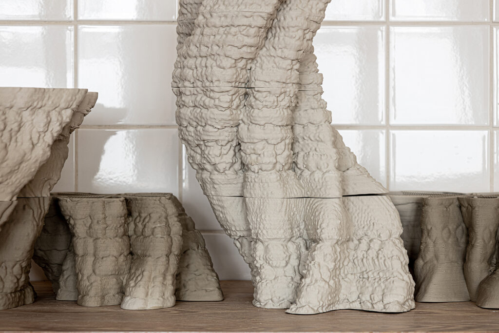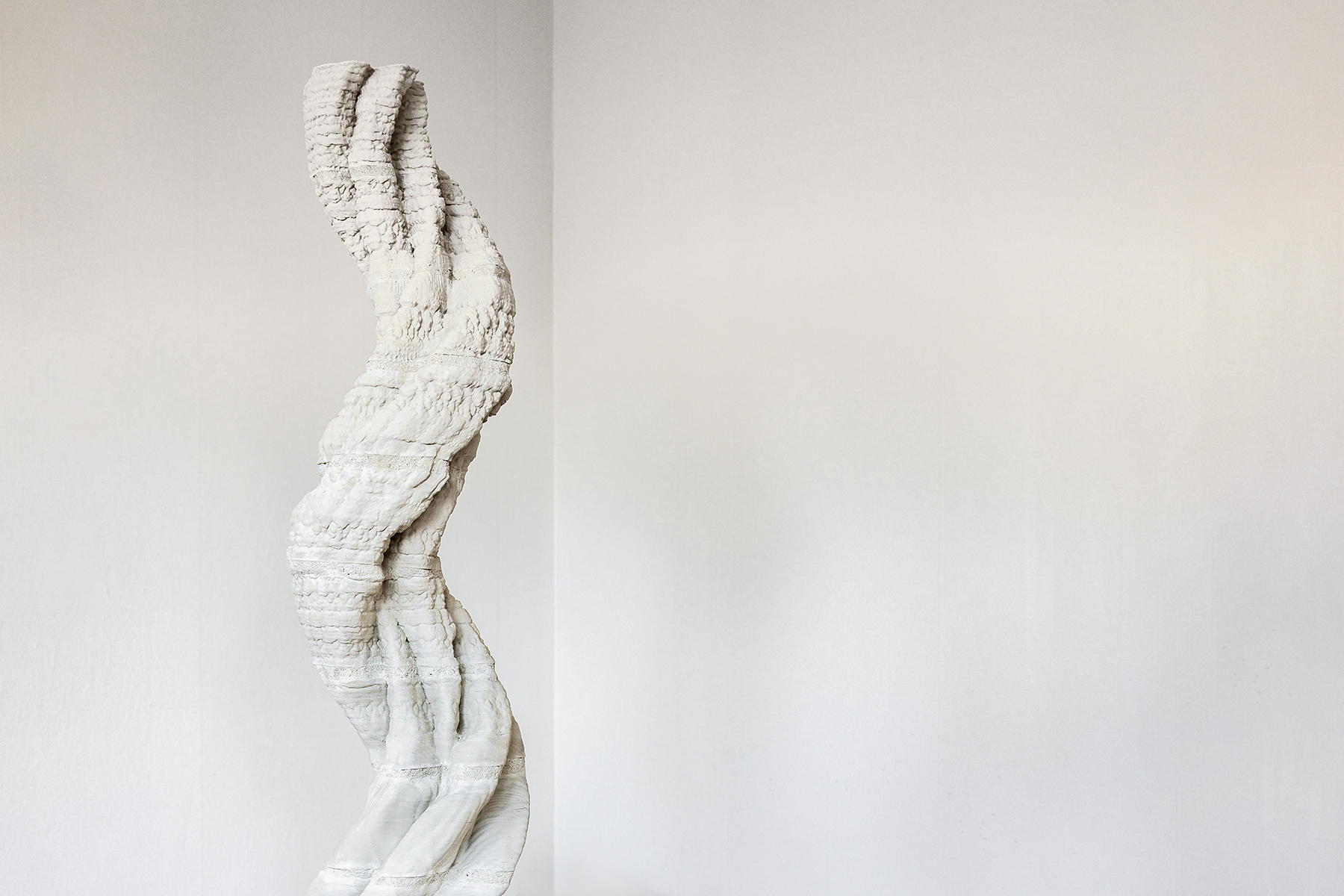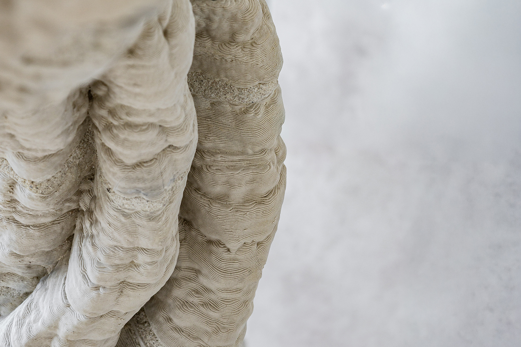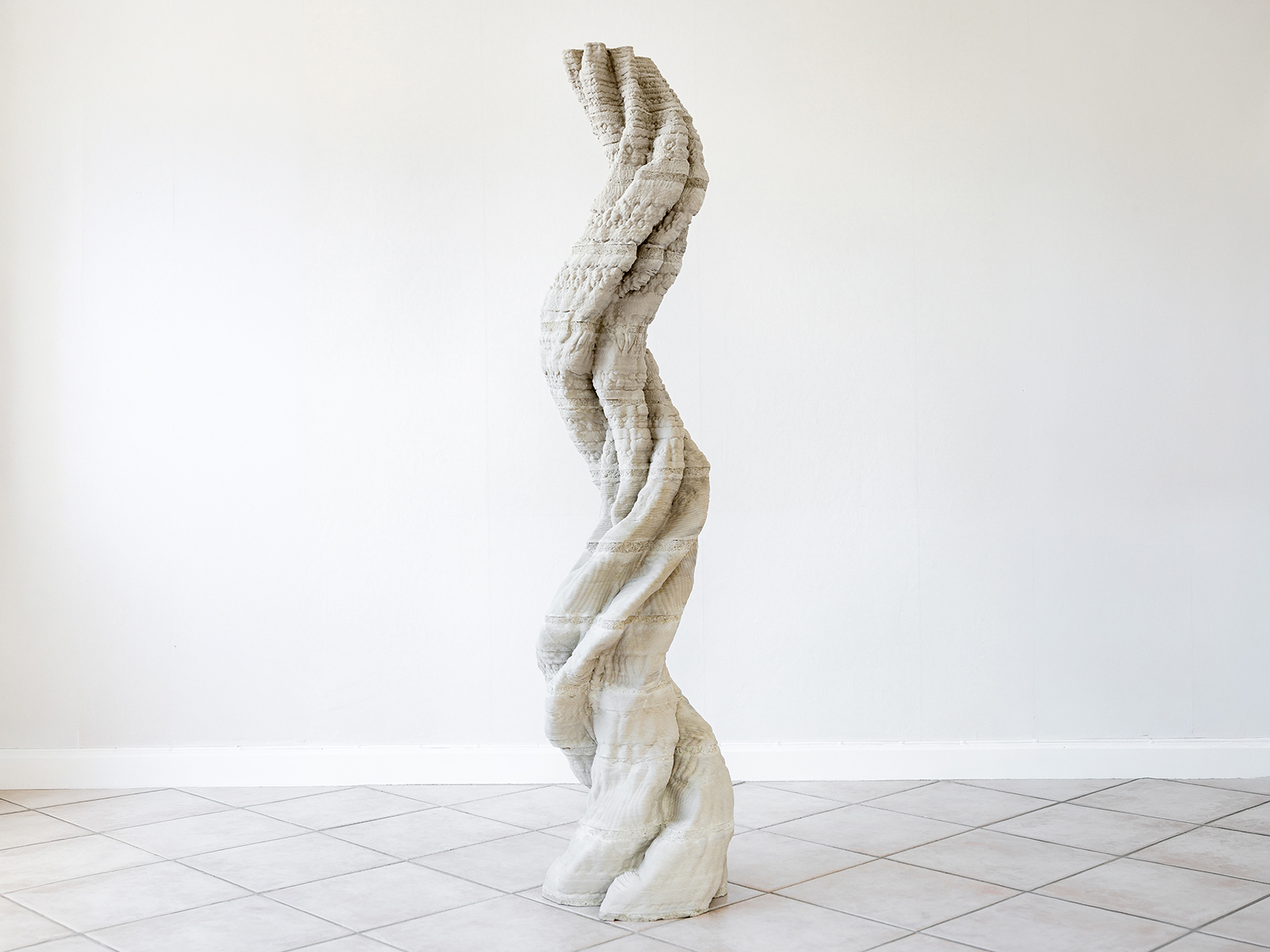 Twisted Column I is the first iteration in the series. It consists of 12 individual 3D-printed ceramic bricks. As the column rises, the resolution of both the digital file and the print line gradually increases, creating a subtle transformation in texture and detail from base to top.