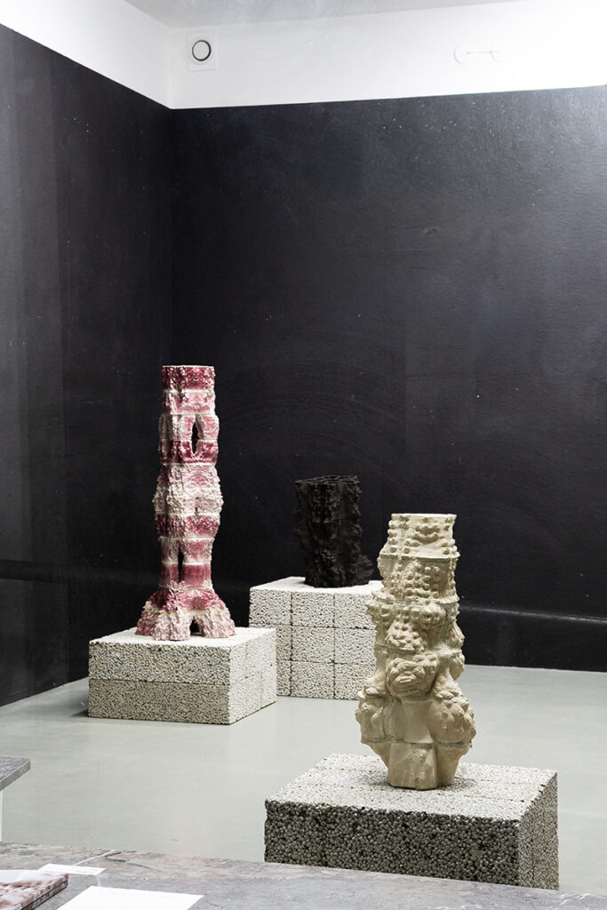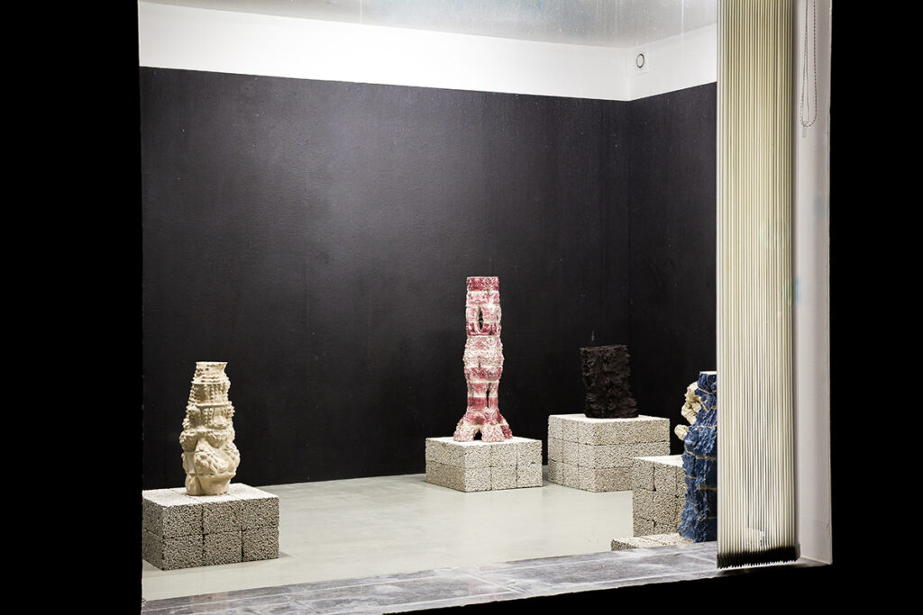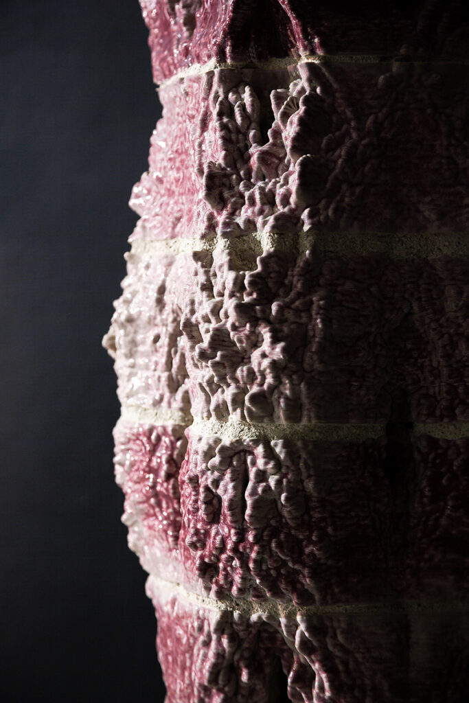The project consists of a series of interwoven ceramic structures composed of 3D-printed bricks. Generated through fractal noise and a set of operations such as scaling, splitting, and reiteration inspired by principles embedded in Hindu temple architecture, the work explores how complex spatial formations can emerge through rule-based iterative growth.